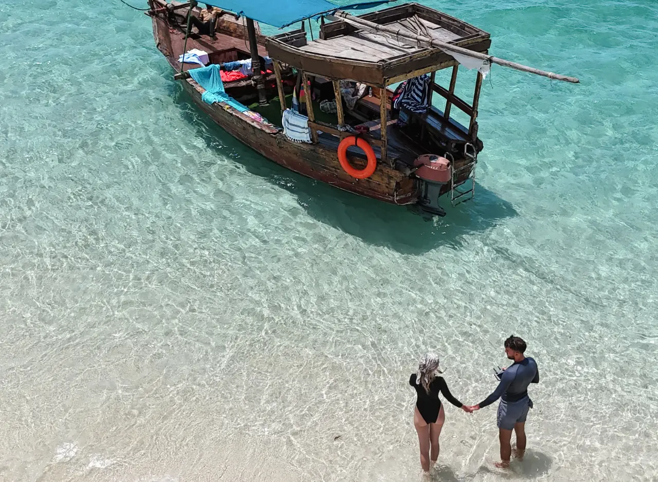Your ocean adventure begins early in the morning with a hotel pickup (if the transfer option is selected) and a short drive to the meeting point near Fumba. Here, you’ll board a traditional handcrafted wooden dhow and set off across the turquoise waters of the Indian Ocean.